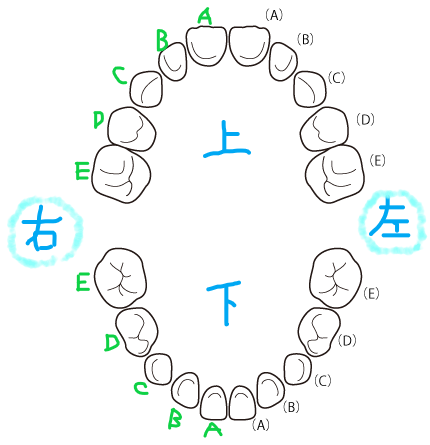 「右上A」「左下C」のように使います。永久歯と同じ仕組みです。