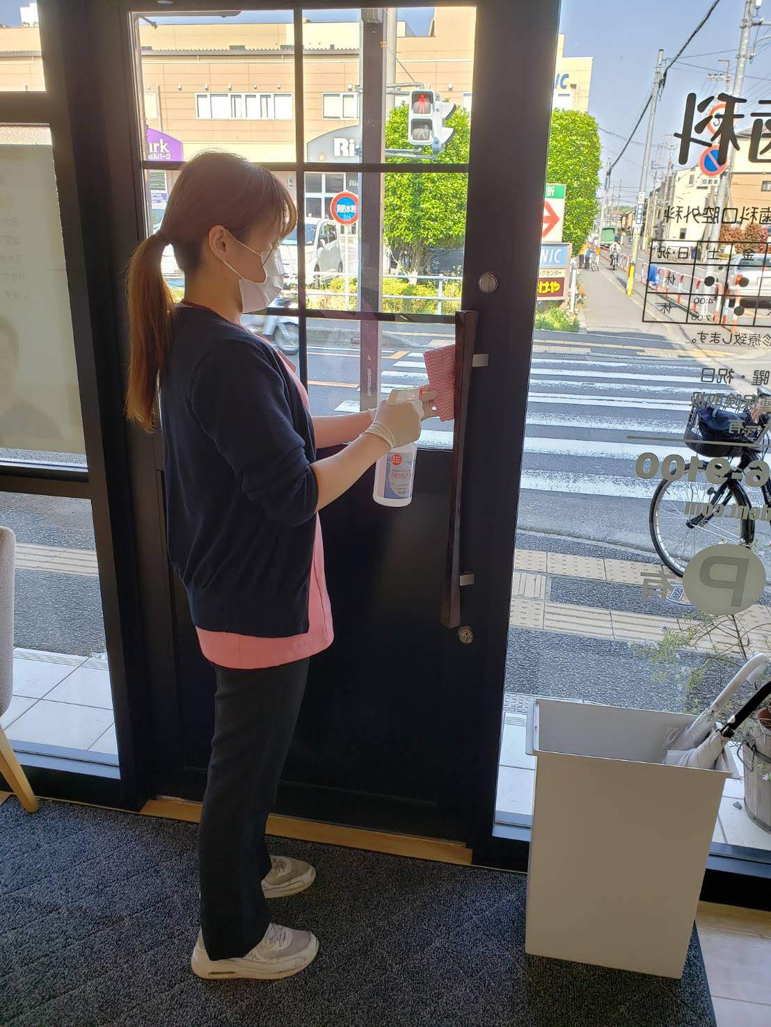 - 受付、トイレ、洗面台、ドアノブ、待合室のイス、キッズスペース全体とおもちゃ等の定期的な消毒